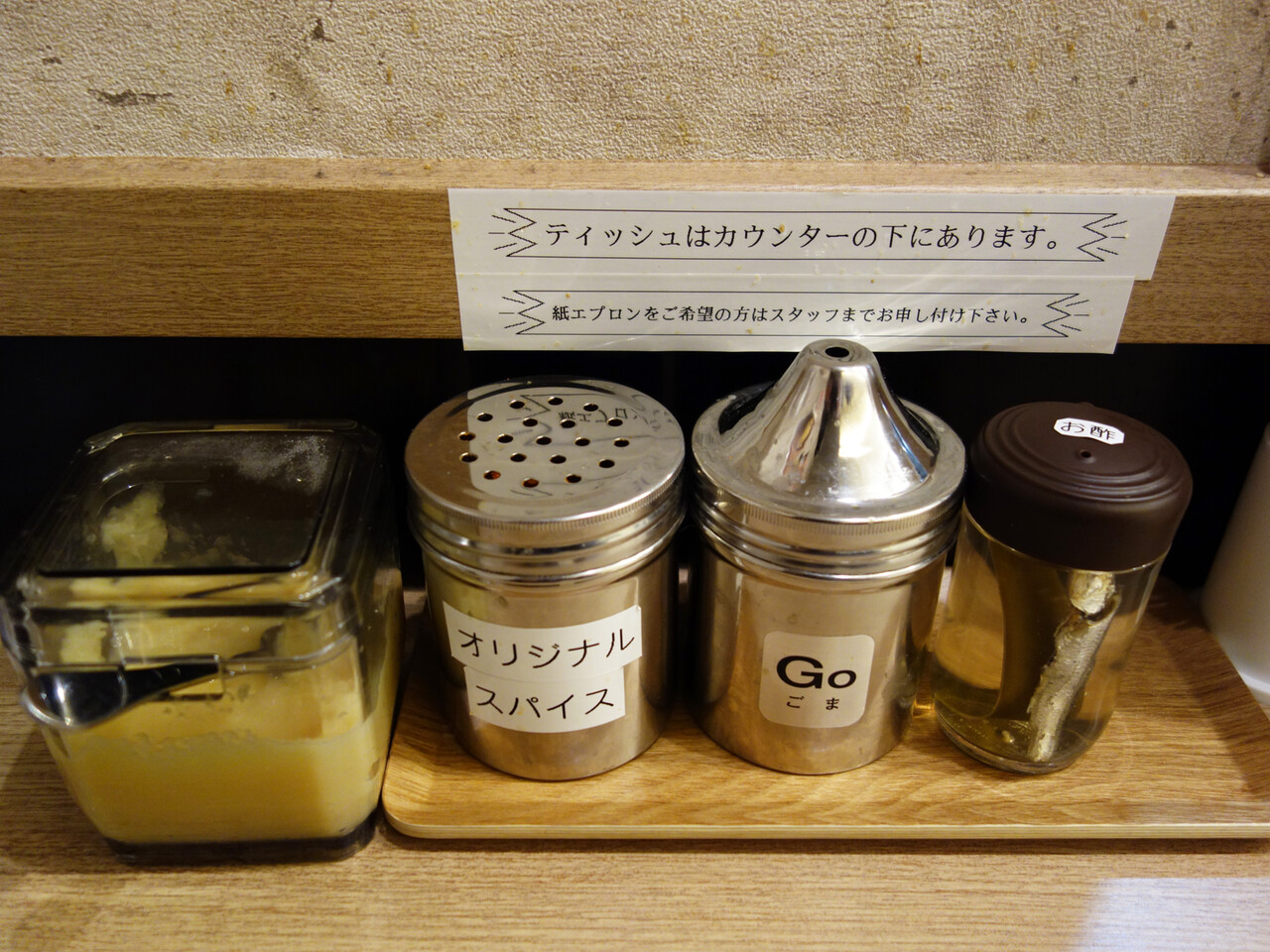 卓上には、ニンニクペースト・オリジナルスパイス(辛味)・ゴマ・調味酢があります。