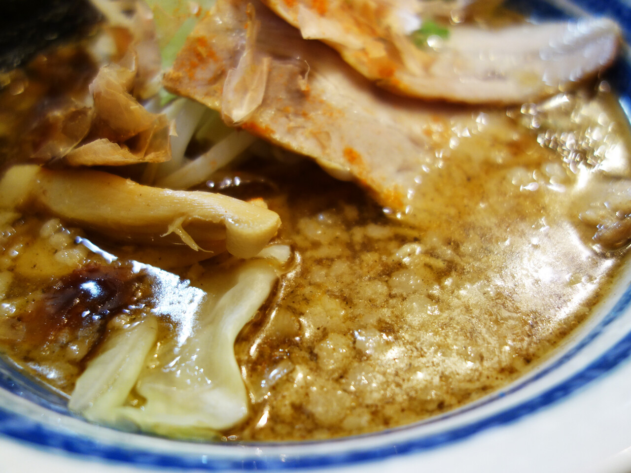 スープの色は醤油濃いし、天かすみたいな大きさの背油がたっぷり入ってます。