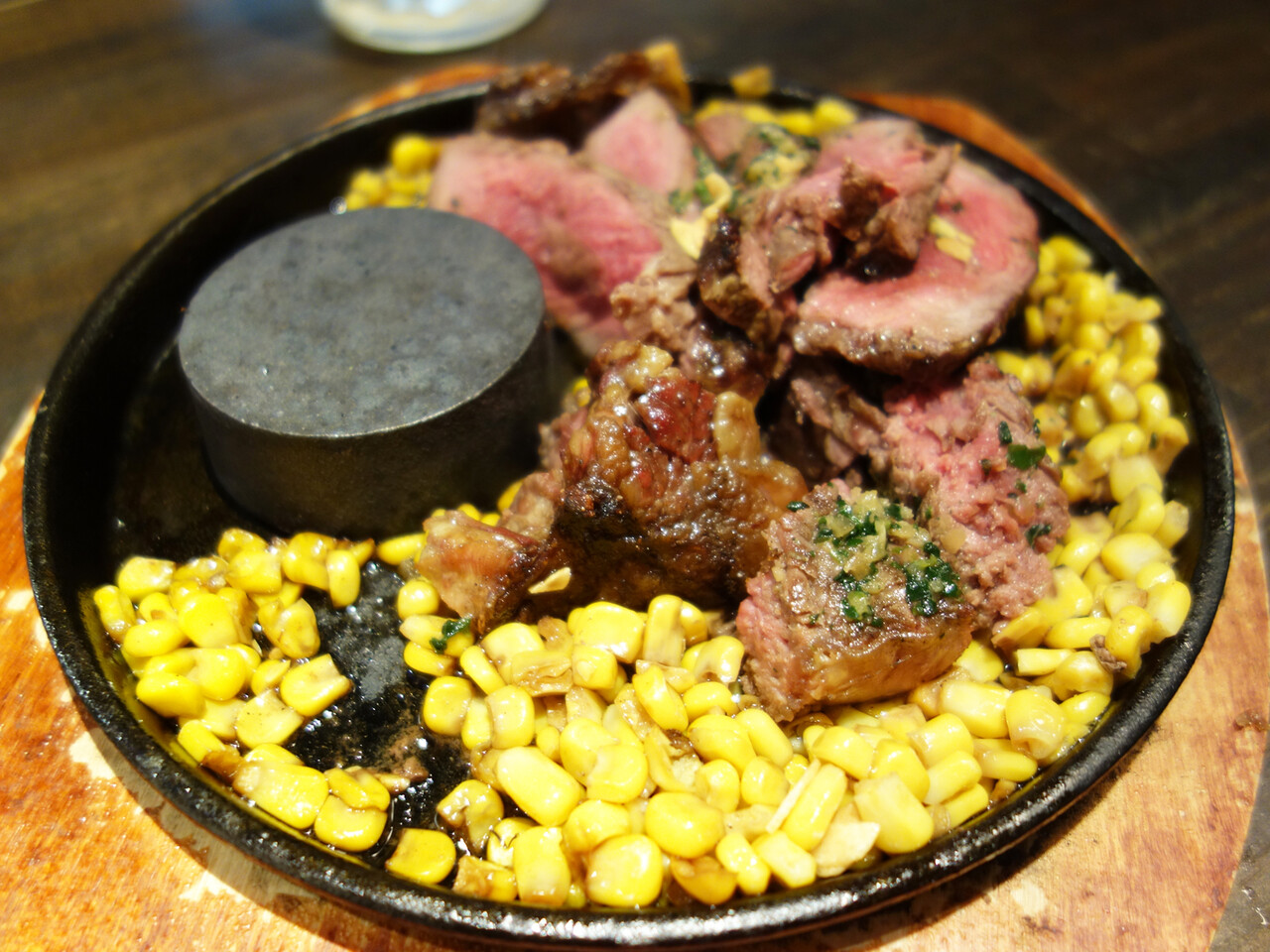 レア状態ですが、鉄板皿にペレット(焼き石)が添えられているので、お好みの焼き加減にできます。