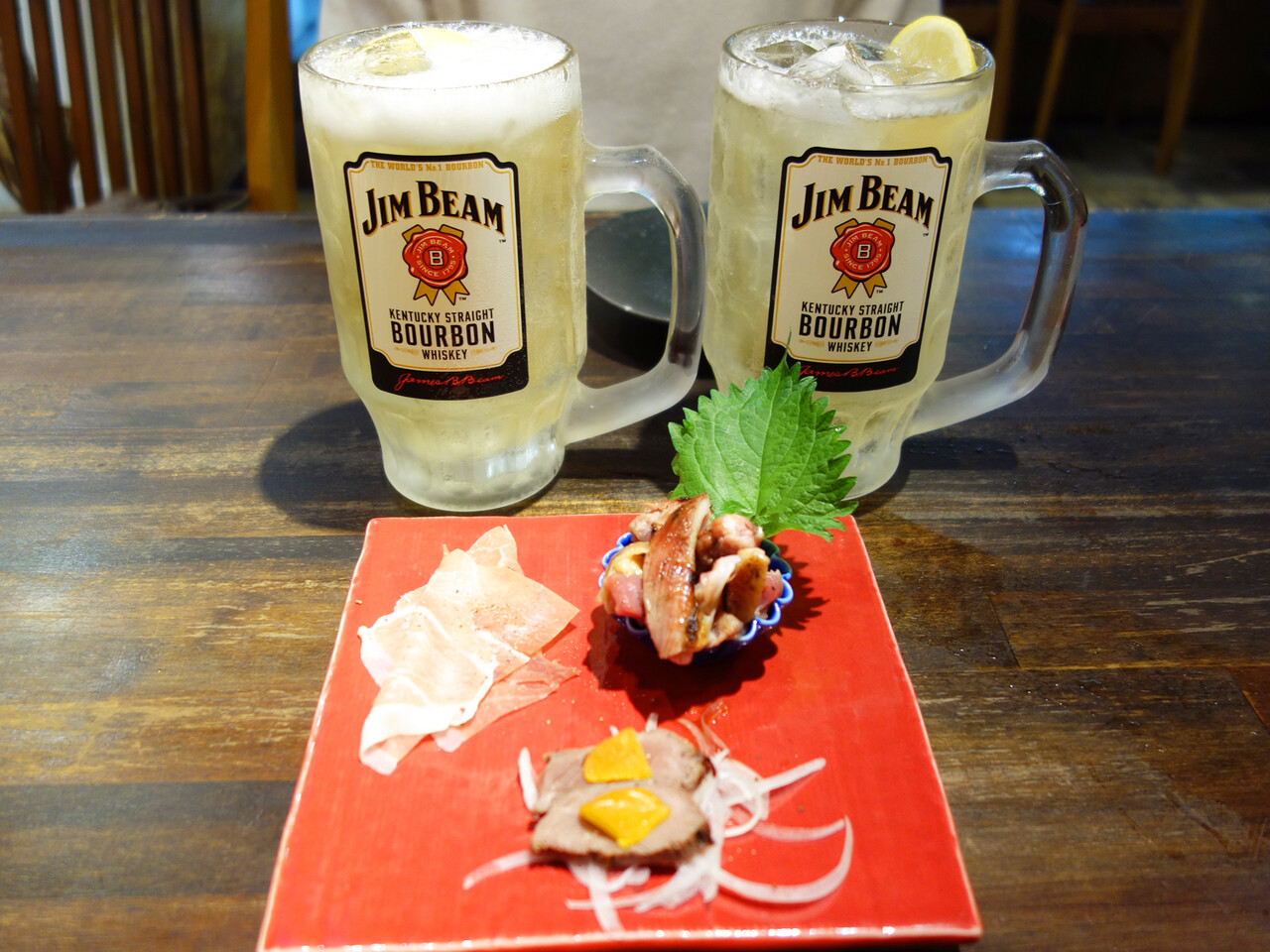 ミツの肉おつまみ三種盛りをつまみつつ、ハイボールのメガジョッキをガブガブ。