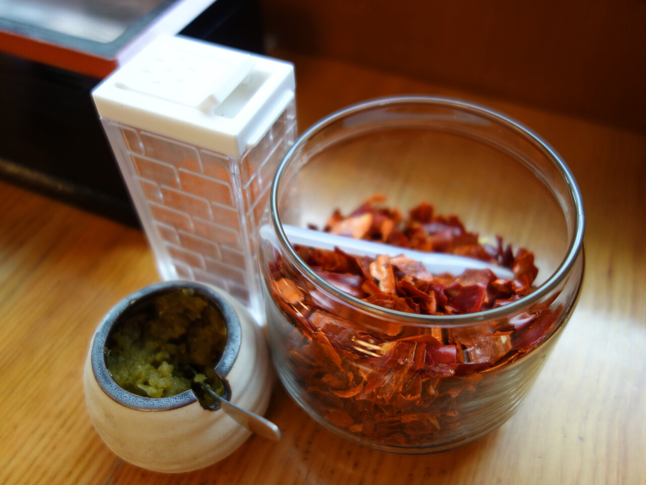 卓上には、唐辛子粉・かなり粗挽き唐辛子・柚子胡椒。