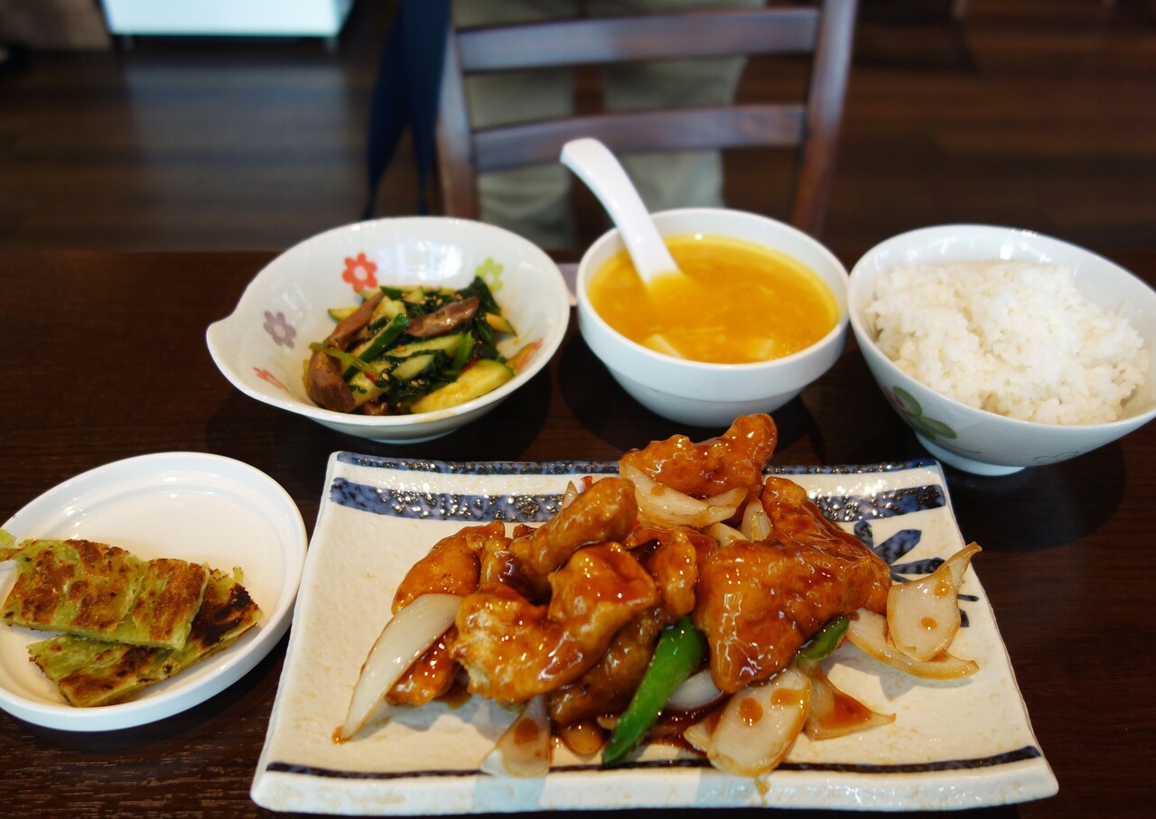 この日は、揚げ白身魚の甘酢味・棒棒鶏・キノコスープ・点心とデザート