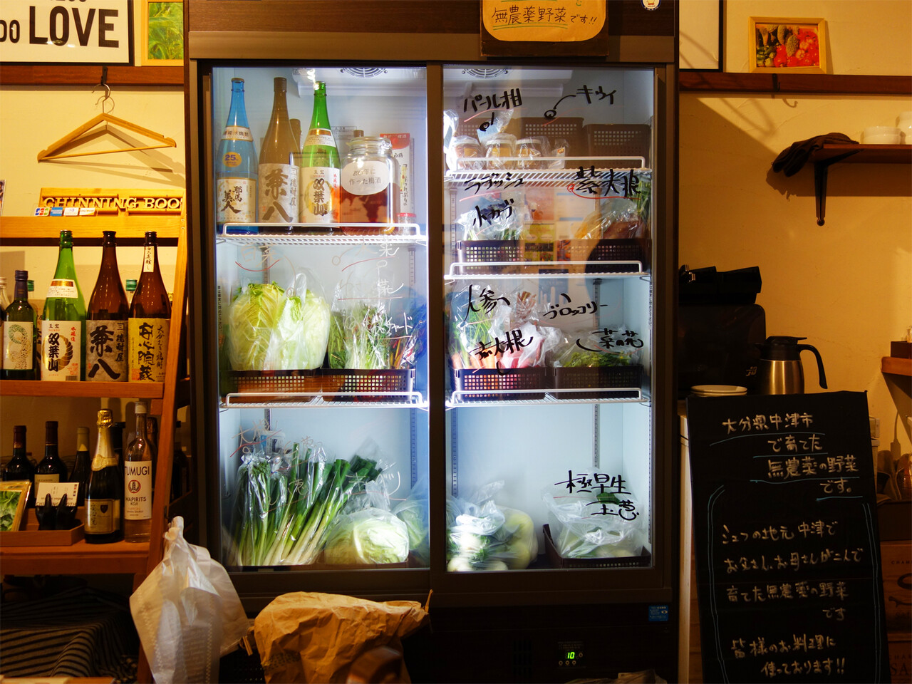 一角にあるガラス張りの冷蔵庫には、シェフのご両親が大分・中津で育てた新鮮な無農薬野菜が色々ディスプレイされていました。