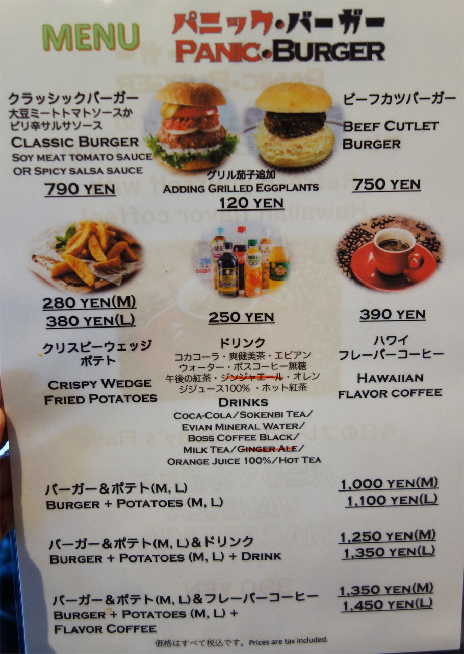 こちらは、併設するヴィーガンバーガー専門店『パニックバーガー』のメニューです。