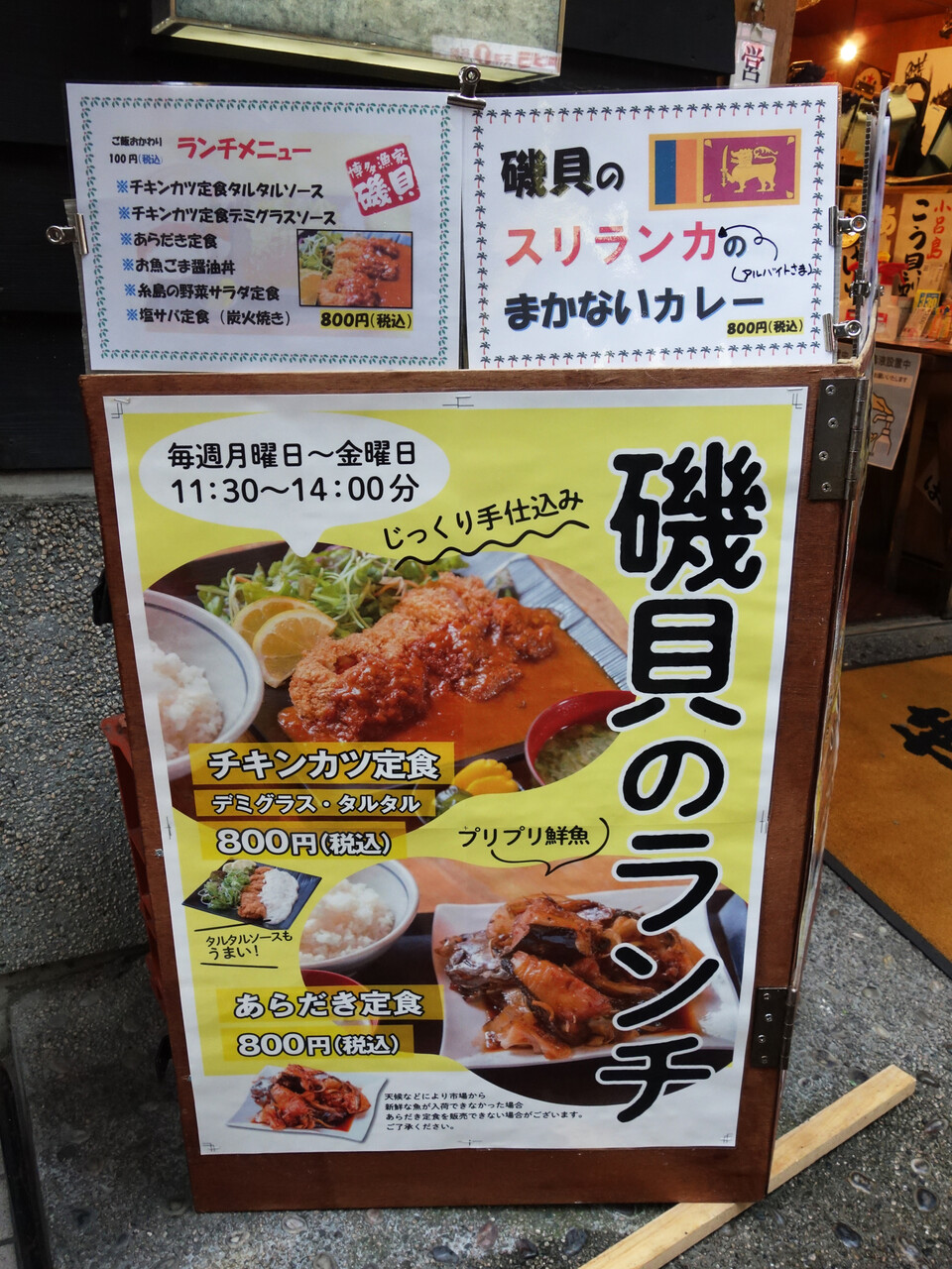 チキンカツ定食(デミグラス/タルタル)800円・あらだき定食800円・お魚ごま醤油丼800円・糸島の野菜サラダ定食800円・炭火焼塩サバ定食800円・スリランカカレー800円。※全て税込み価格。