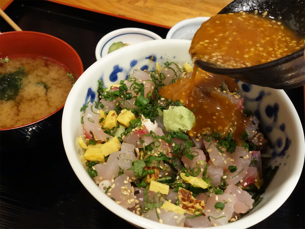 卵黄を落としたゴマダレをまぜまぜして、海鮮丼にかけて頂きます。