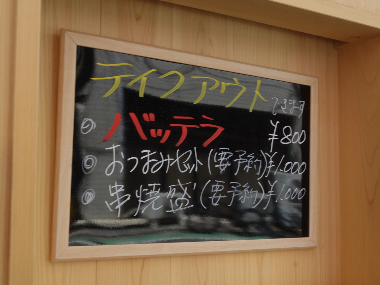 テイクアウトのメニューは、バッテラ800円・おつまみセット1,000円・串焼盛1,000円です。※要予約。