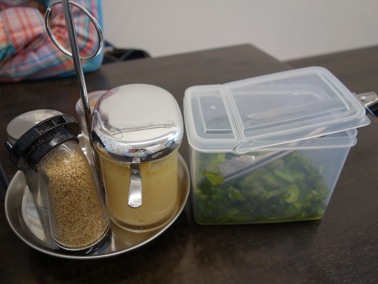 卓上には、ニンニクペースト・コショウ・スリゴマ・きゅうりのキューちゃん。