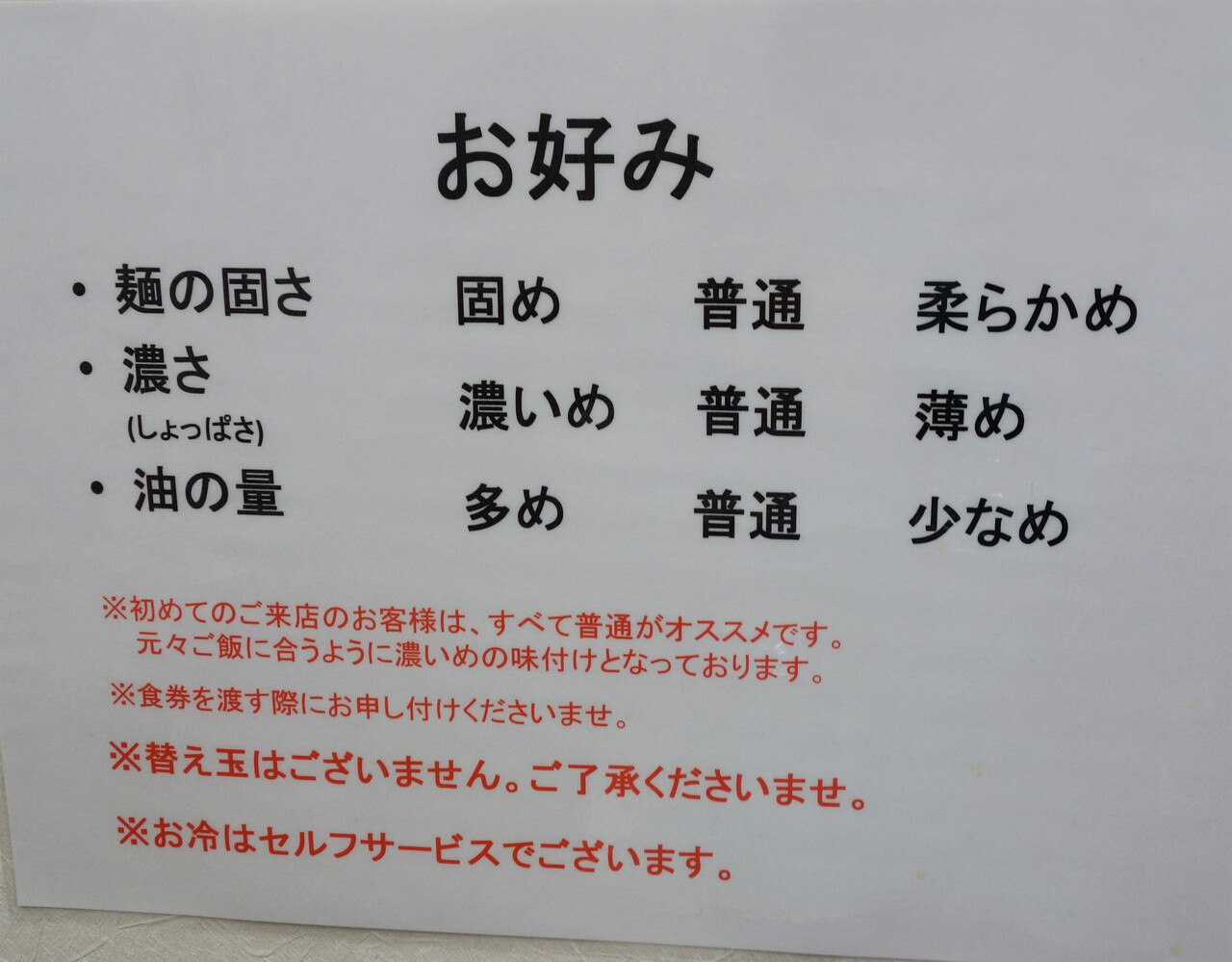 味の濃さ・脂の量・麺の硬さもリクエスト出来ます。