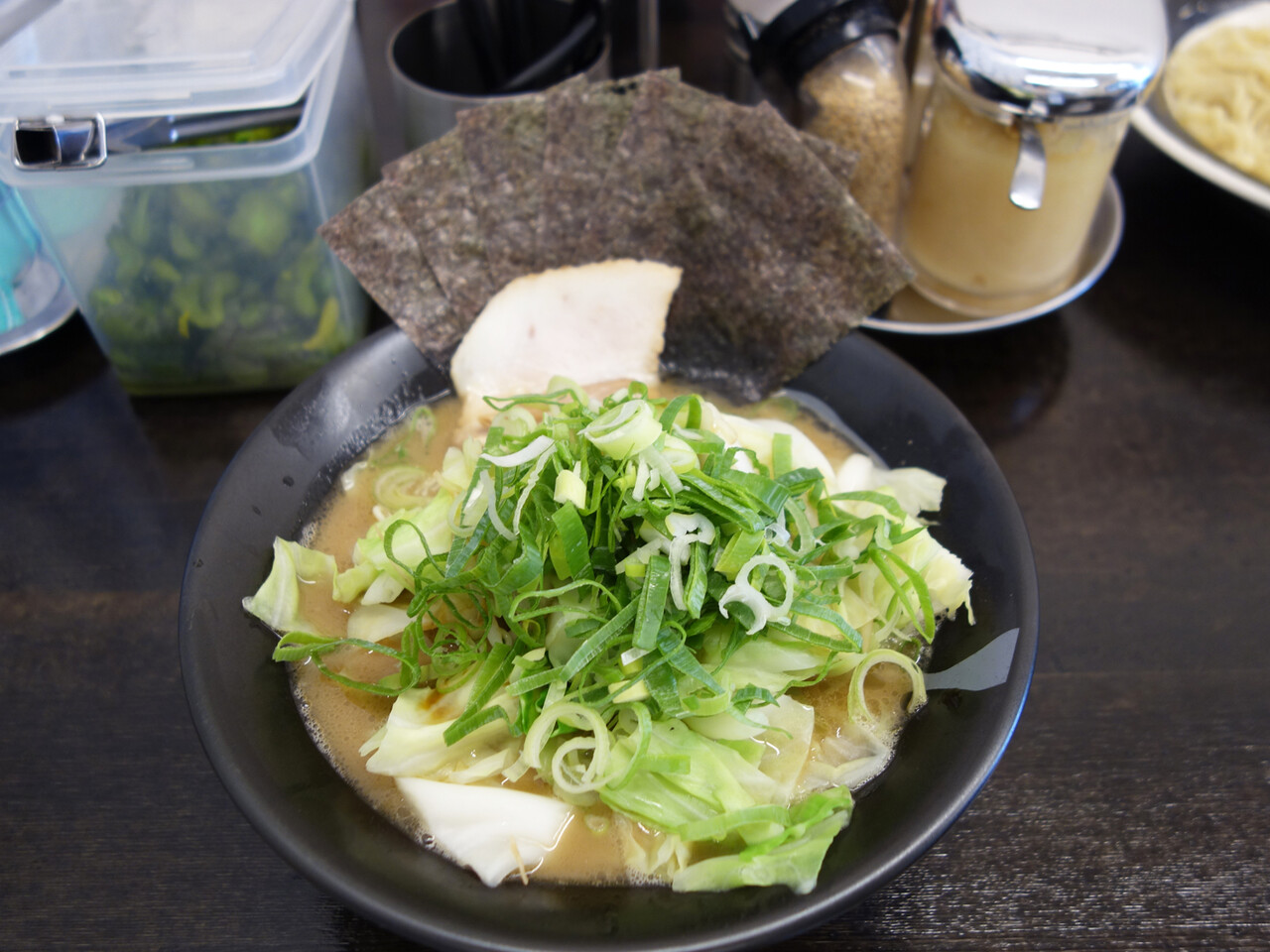 基本の醤油豚骨ラーメンに茹で野菜とネギがのったものです。