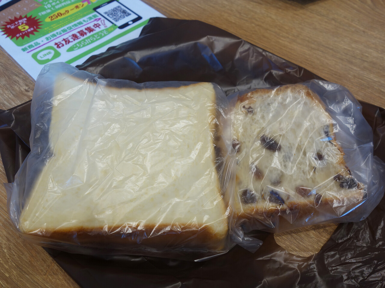試食用に博多本仕込の食パンとラム酒漬けレーズン入りの極レーズンブレッドを頂きました。