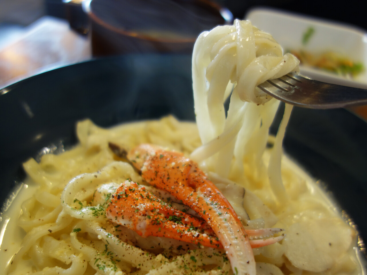 麺は平打ちで、うどんという先入観があるからかもしれませんが、ヤワモチなうどんっぽいです。
