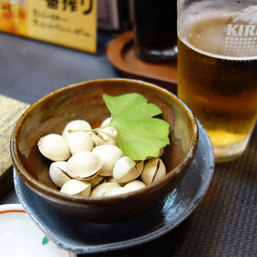 餃子が来るまで、ビールと焼き銀杏。
