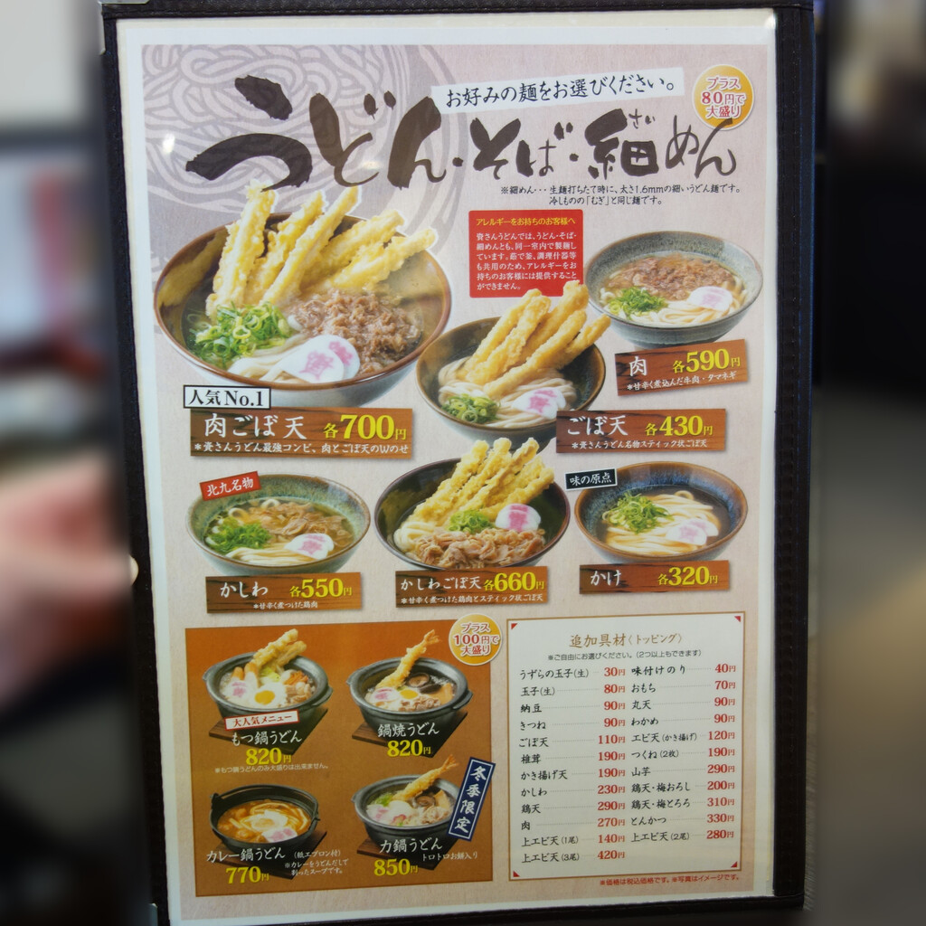 福岡うどんの定番『ごぼ天』は430円、人気の『肉ごぼ天』は700円。