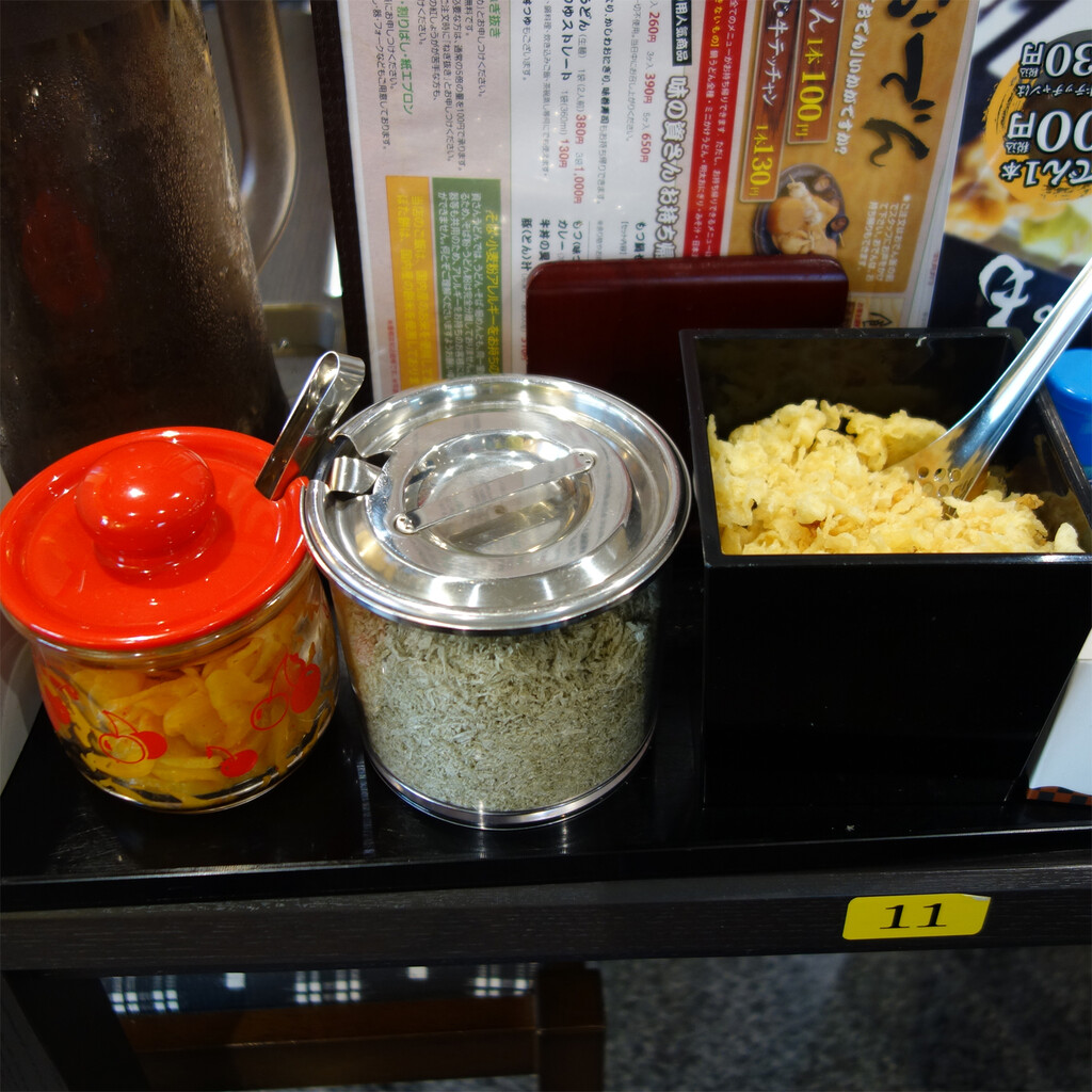 卓上にはつぼ漬けと天かすもあり、取り放題ですが、ネギの追加は有料です。