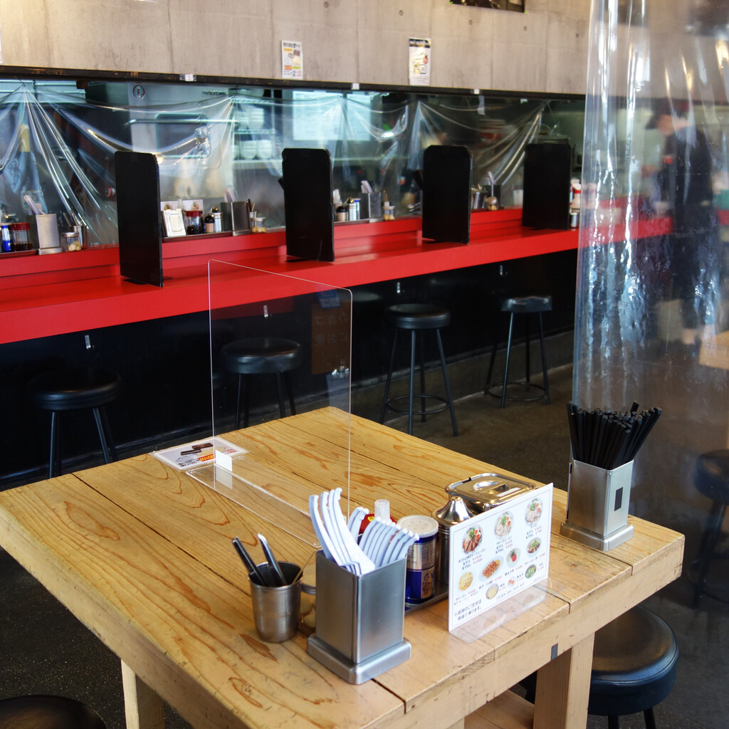 店内は、カウンター席とテーブル席にコロナ対策用アクリル板が設置されています。