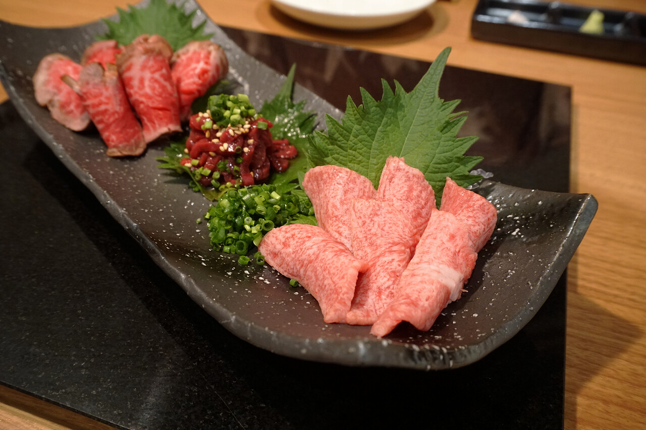 手前:炙り肉刺し。適度のさしが入った上質な赤身です。炙ることで旨味が凝縮され、美味しいです。