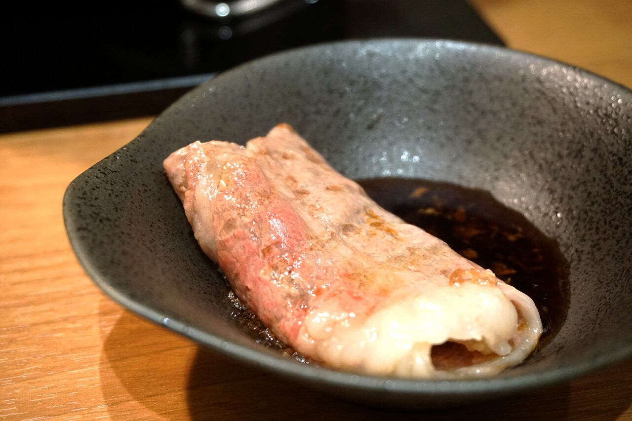 焼きしゃぶは、お肉を炙った後、くるくると巻いてもらって、専用のたれで頂きます。
