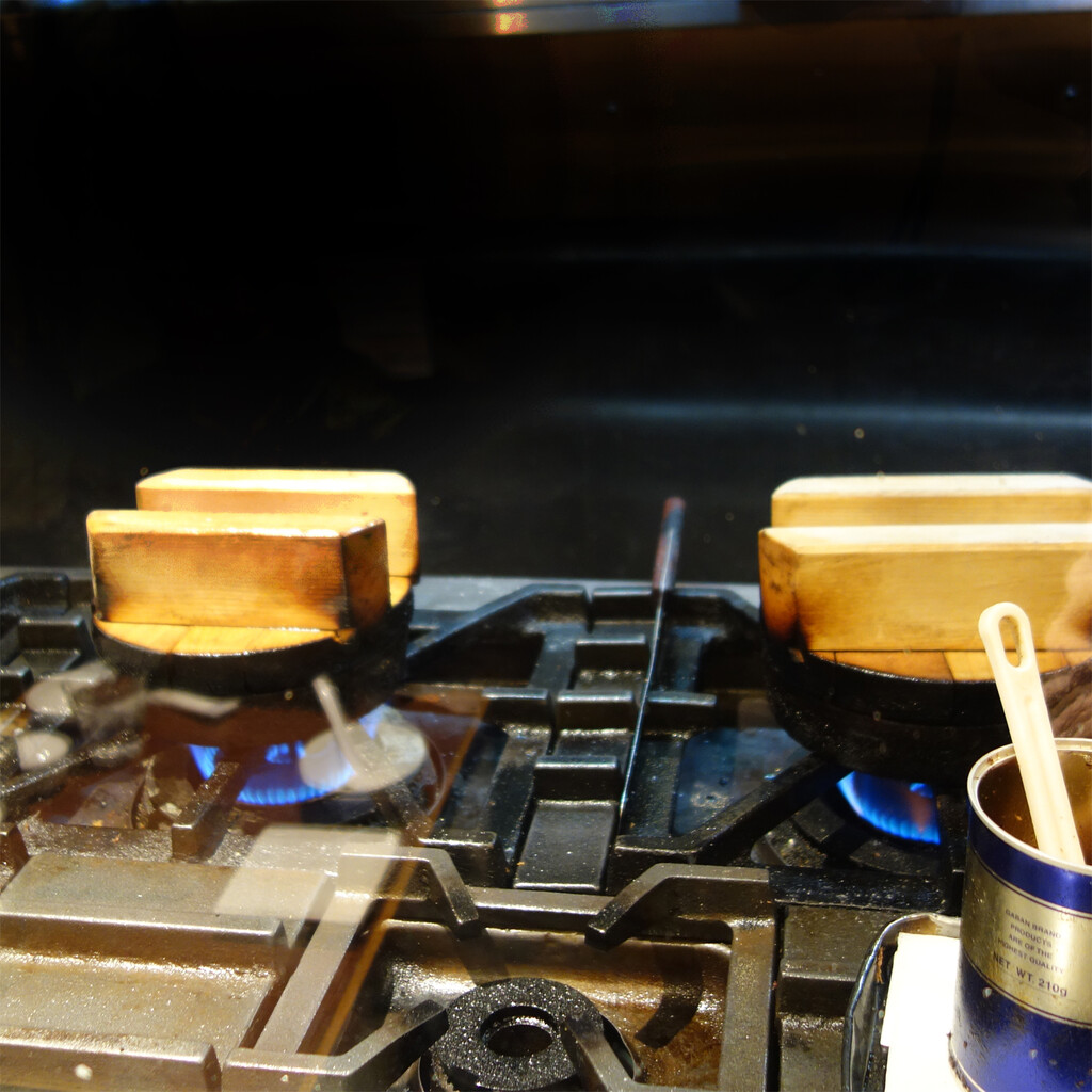 厨房を見ると、料理人さんが炎を上げながら鍋を振ってましたよ。
