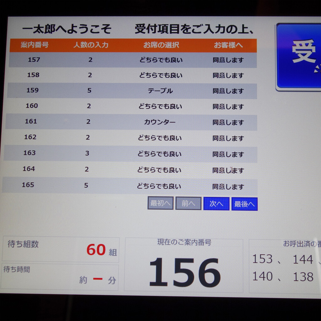 番号発券機に、人数と席の希望(カウンター・テーブル・どちらでも良い)を入力して、番号札を取って待ちます。