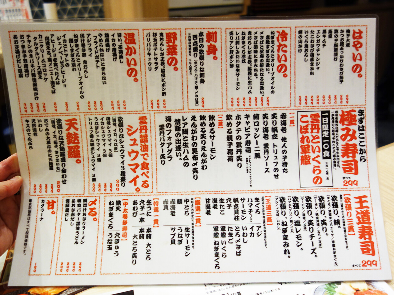 お寿司とおつまみとお酒で、一人から気軽に楽しめます。一品料理はほぼ299円。