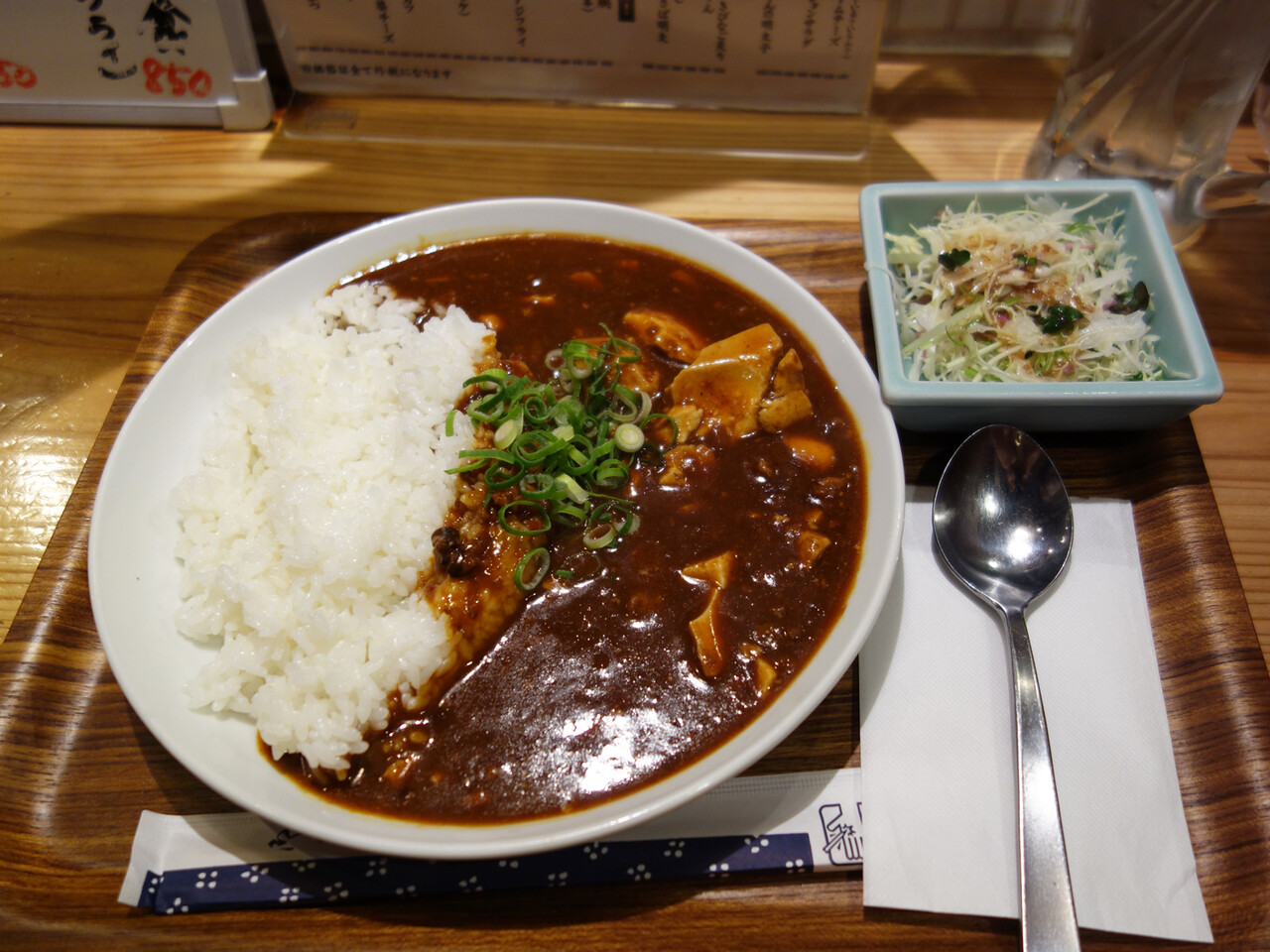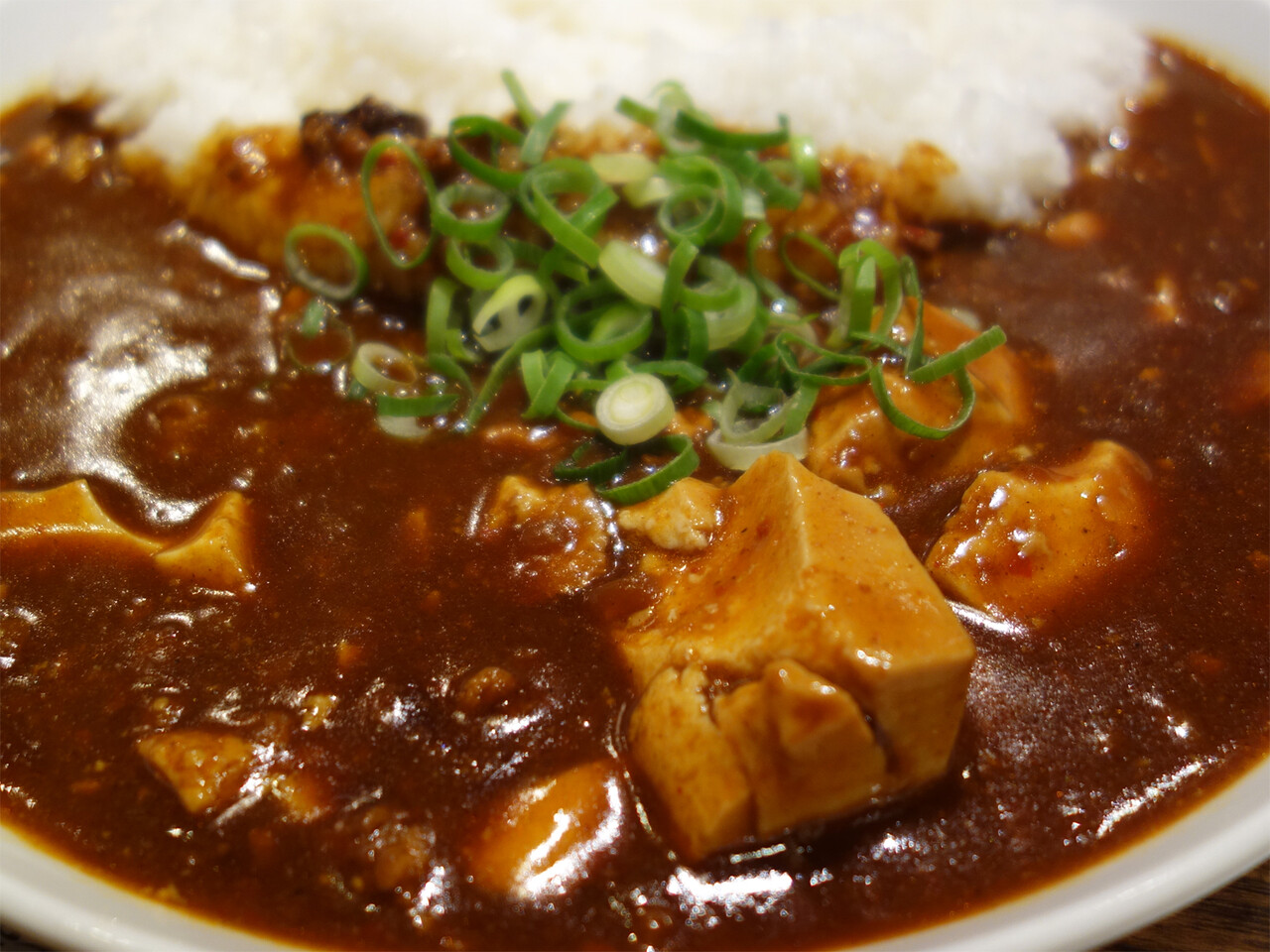 カレーの具が豆腐とひき肉ということかな、と思ったら結構マーボーの味でした(笑)。