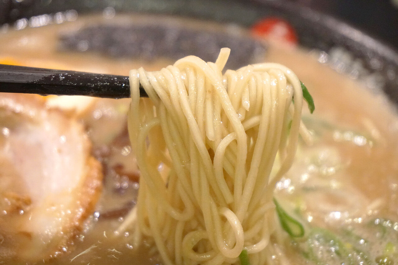 麺は長浜よりも、やや太めのストレート。スープとのバランスが良い、入念に研究された自家製麺です。