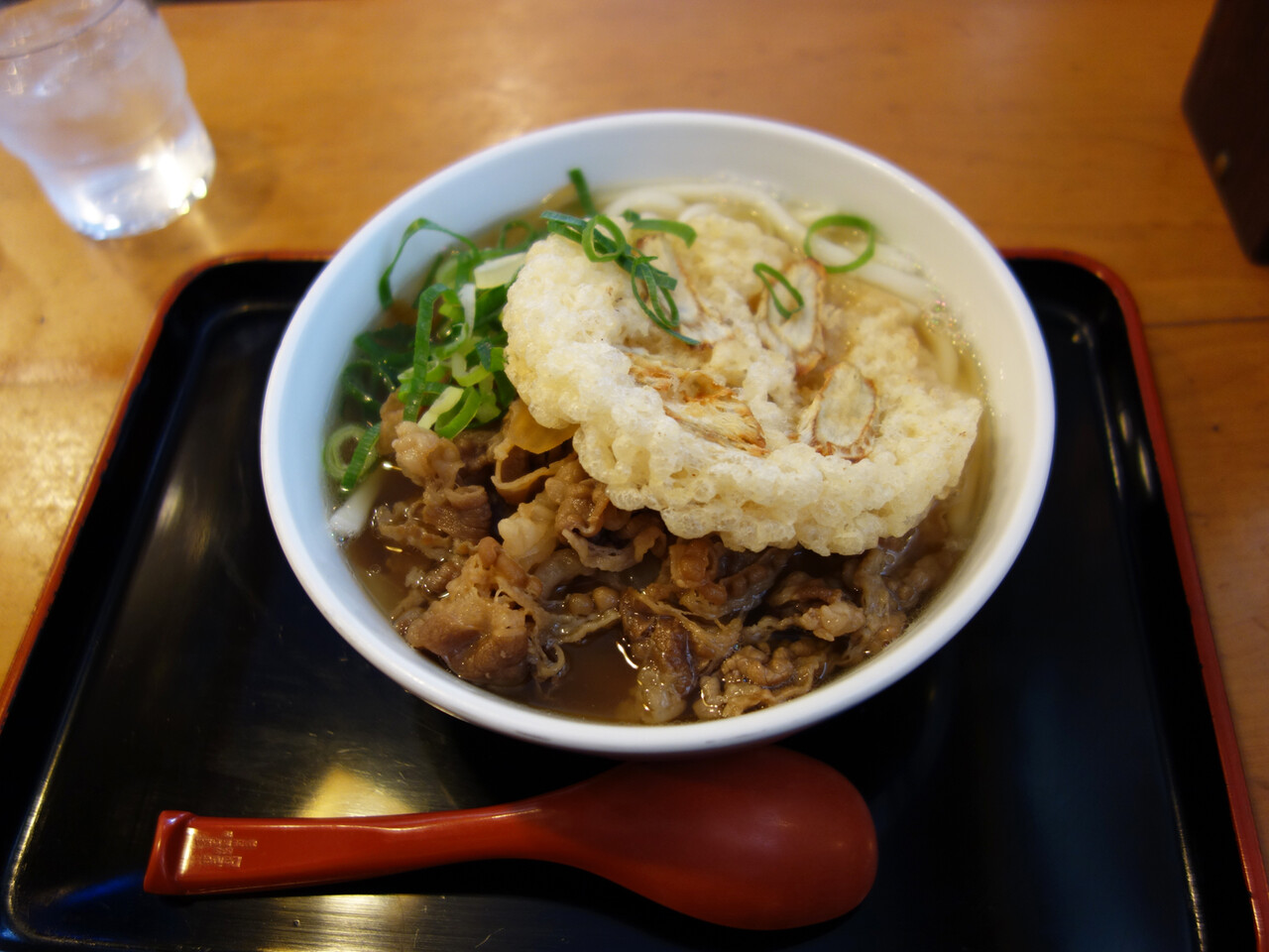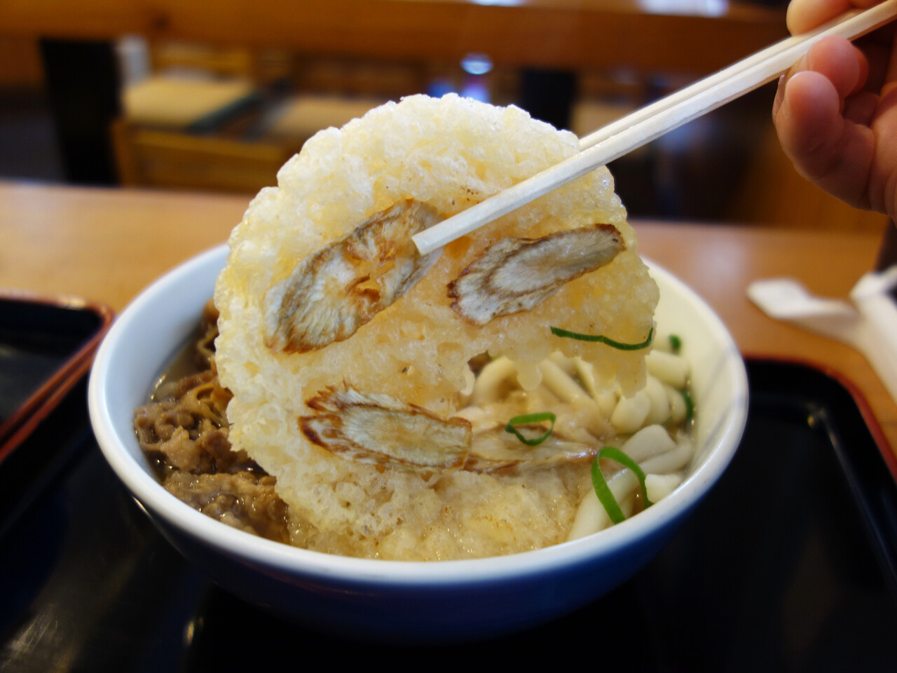 かけうどんの上に、ごぼう天と甘辛く炊いた牛肉をのせたもの。