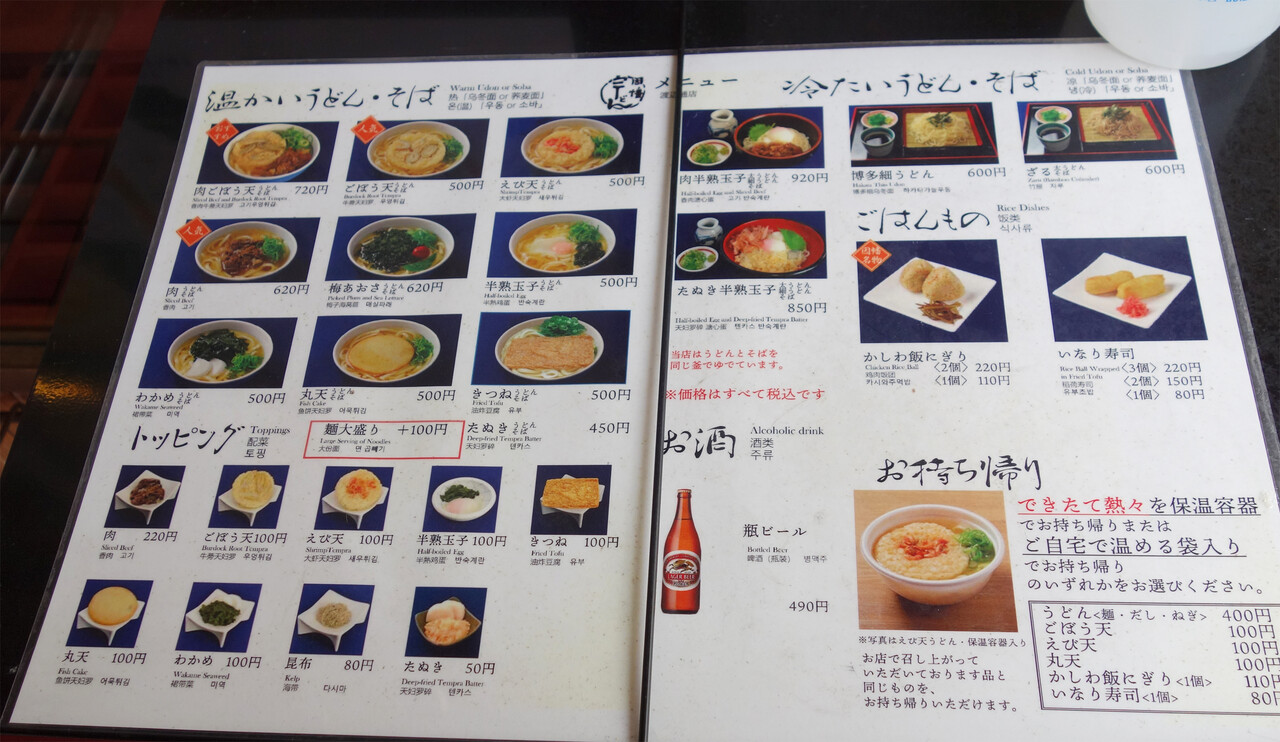 博多うどんの基本とも言える、ごぼう天うどんや丸天うどんは500円。