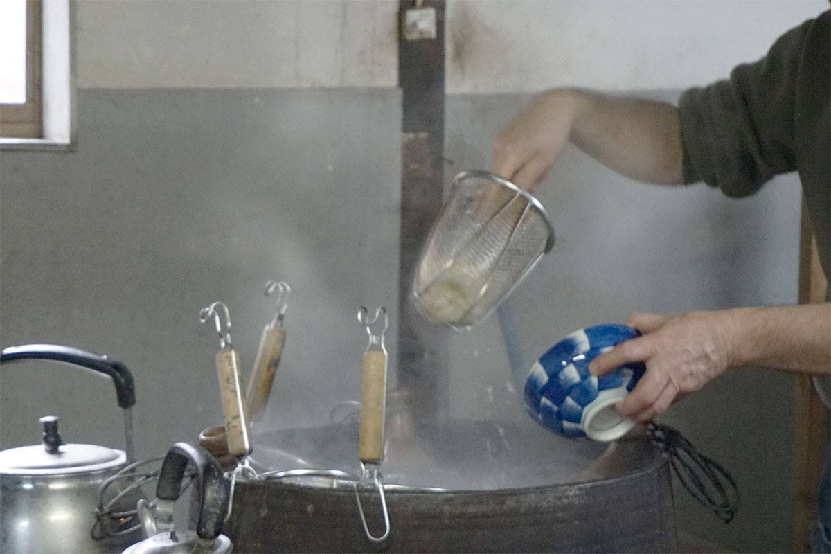 調理場には大きな釜があり、つゆが入った大きな徳利が湯煎で温められており、