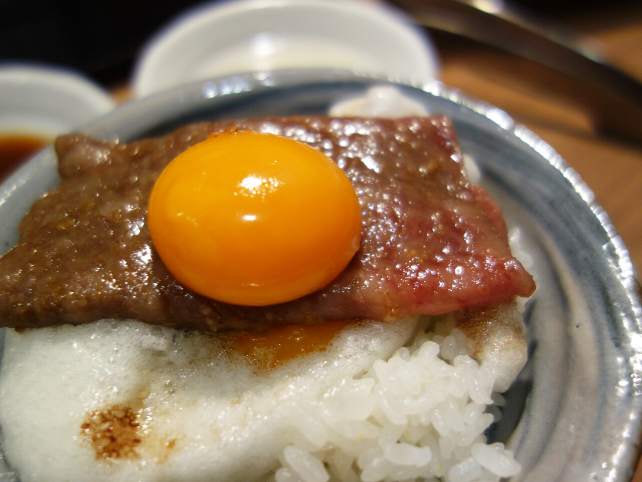 焼き師の方がさっと焼いてくれたリブロースをTKGで!