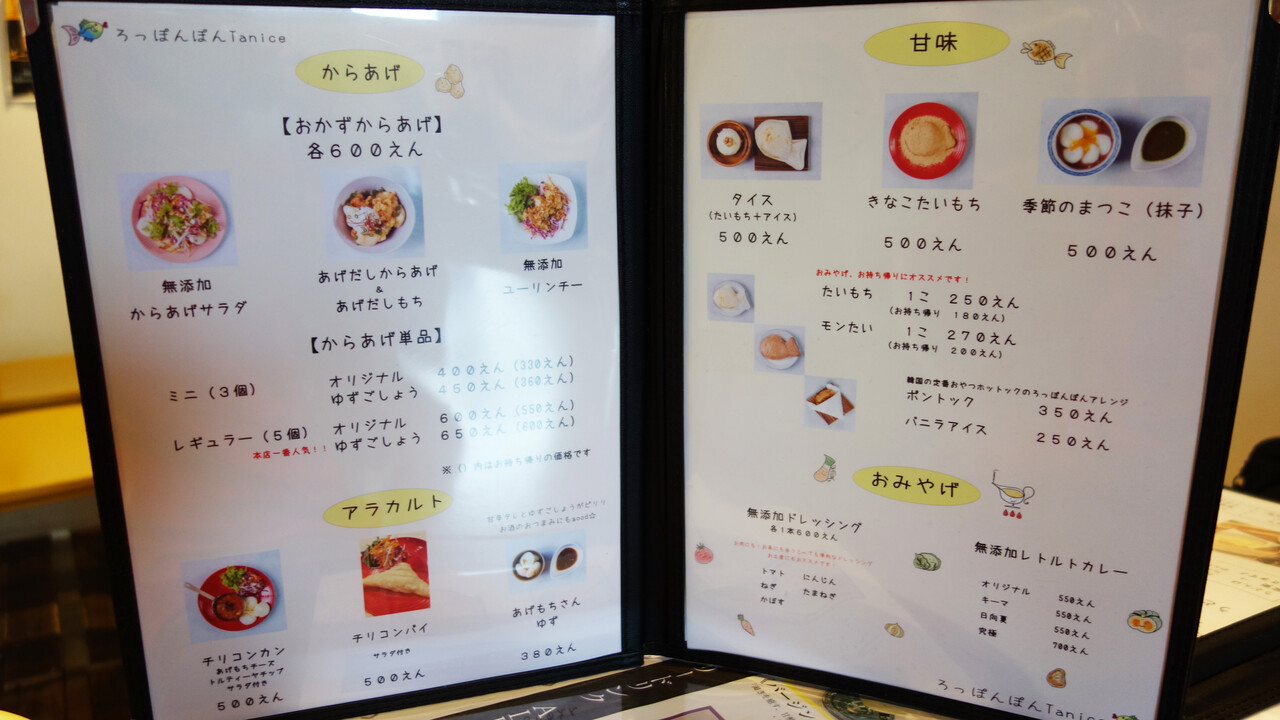 こちらは、たいもちと唐揚げの専門店『ろっぽんぽん』の単品メニュー。