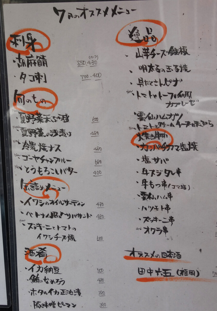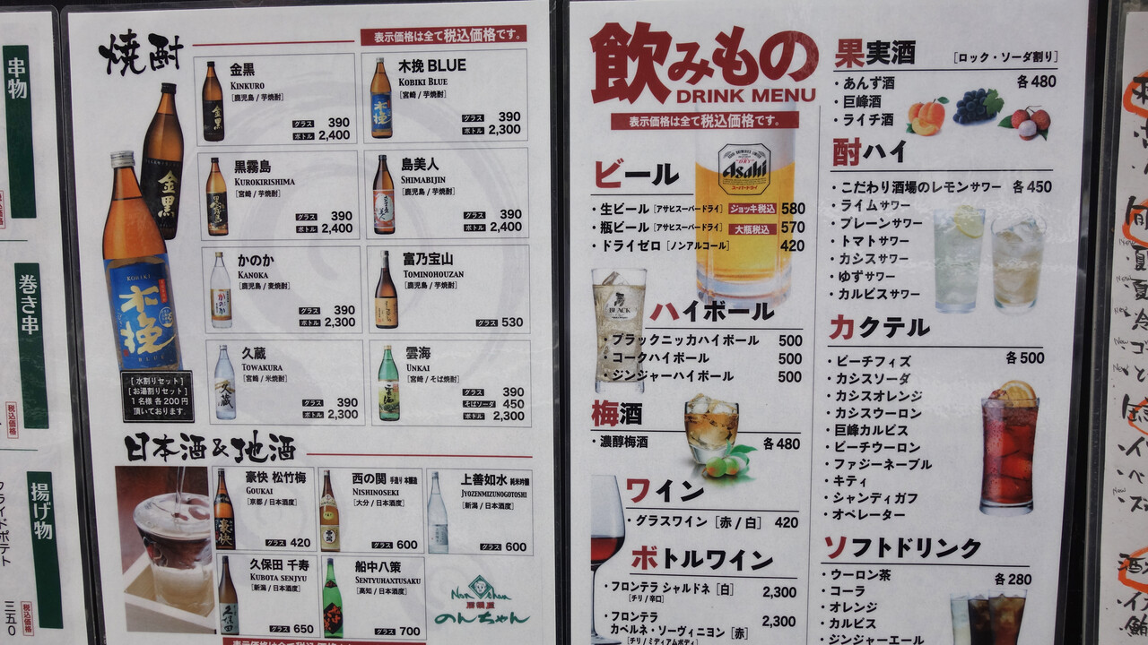 屋台発祥のお店だそうで、1本90円〜の焼鳥や居酒屋料理、屋台発祥のメニュー『焼きラーメン』などのメニューがあります。