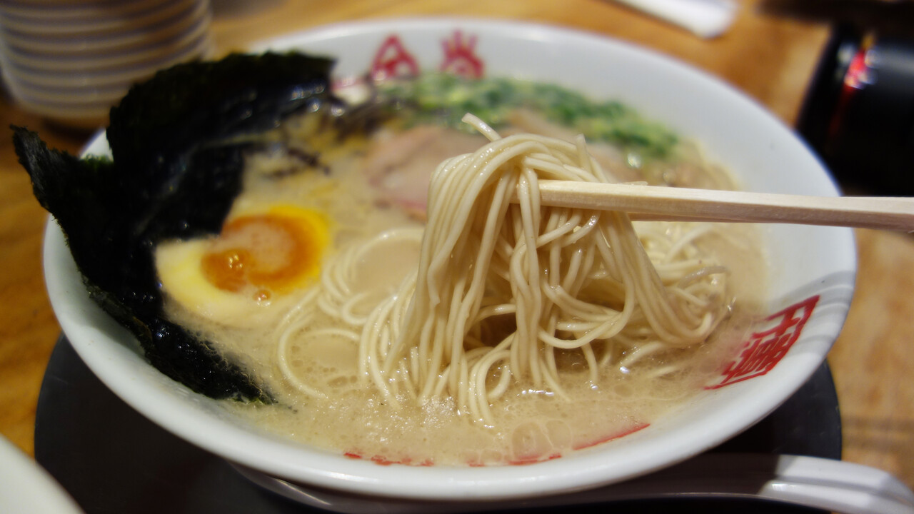 麺は、豚骨ラーメンの小麦の風味がする細麺ではなく、滑らかな食感の麺。