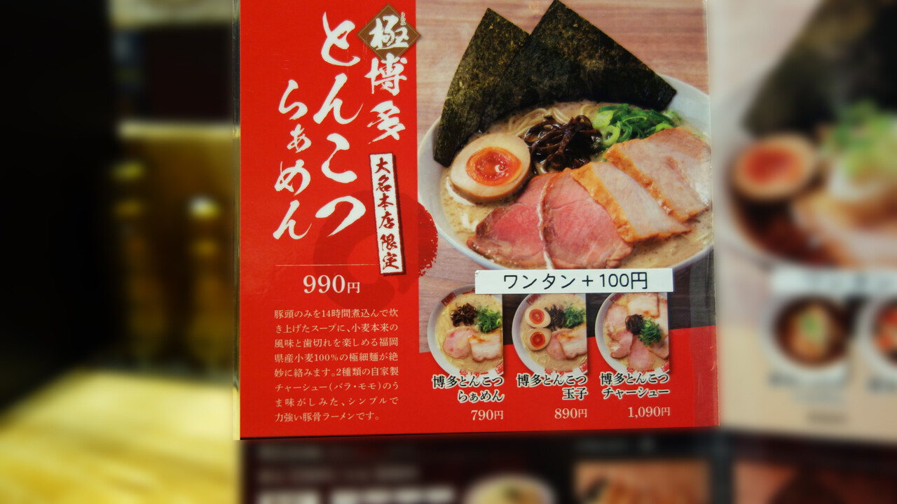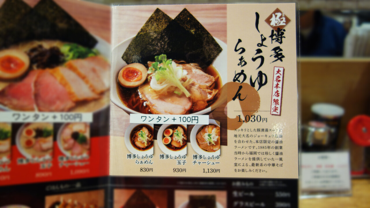 ベースに『博多とんこつらぁめん』790円と『博多しょうゆらぁめん』830円があり、