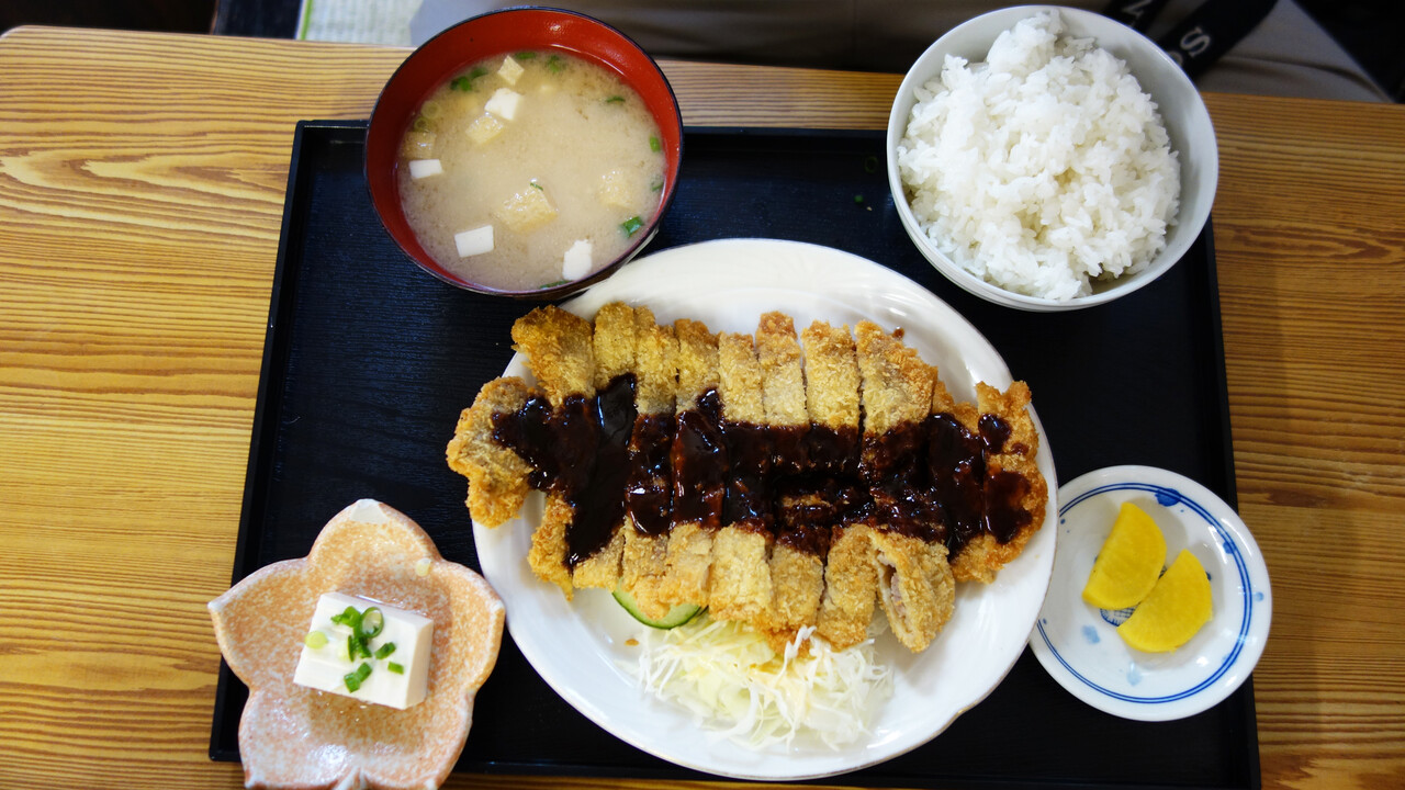ワラジを思わせるようなトンカツに、ご飯・味噌汁・冷奴・お漬物が付いています。
