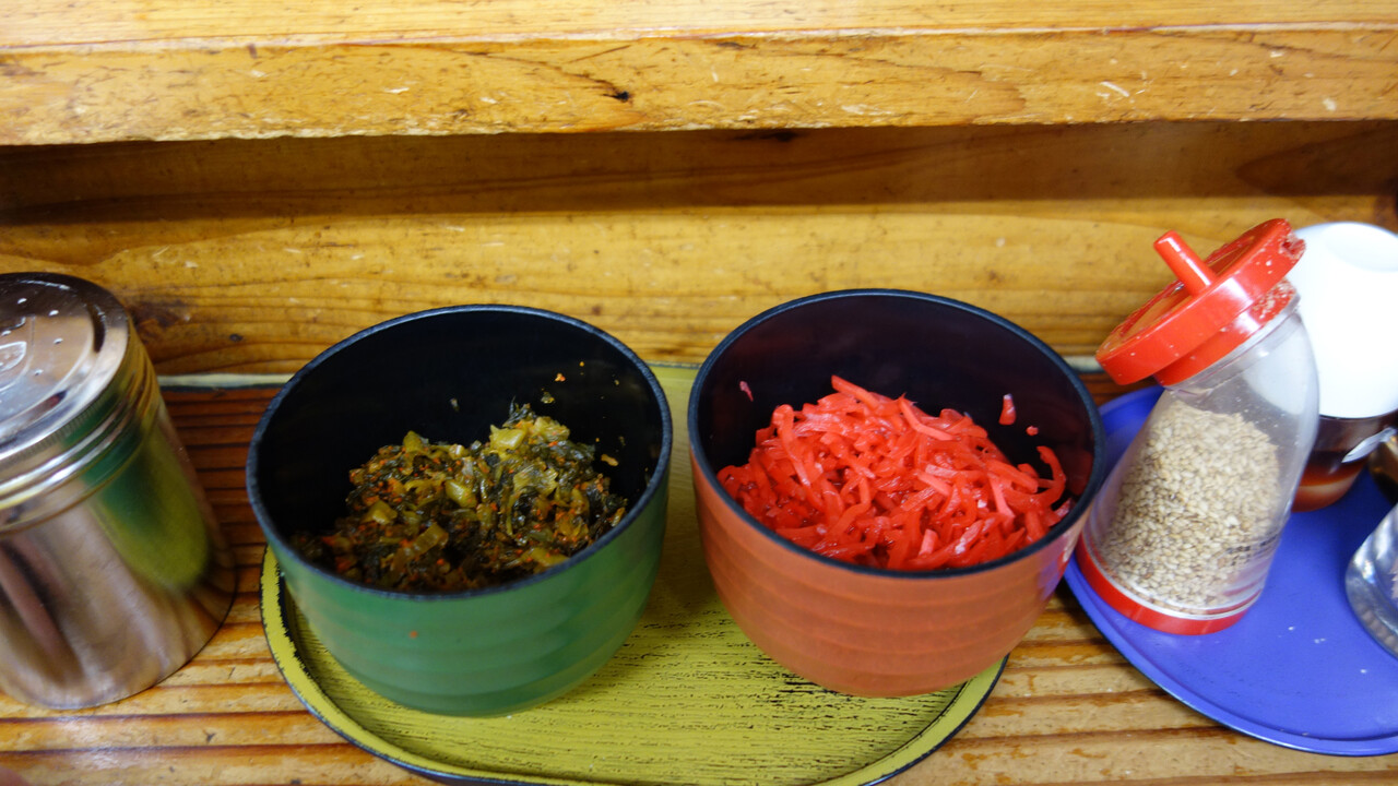 卓上には、紅ショウガや辛子高菜、ゴマ、コショウなど豚骨ラーメン用のトッピングがあります。