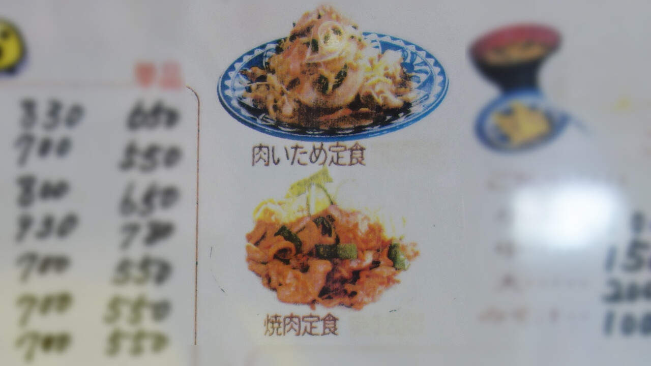 テキスト表示の中、イラスト画像が載っている『肉いため定食』と『焼肉定食』がウリなのかなと思い、