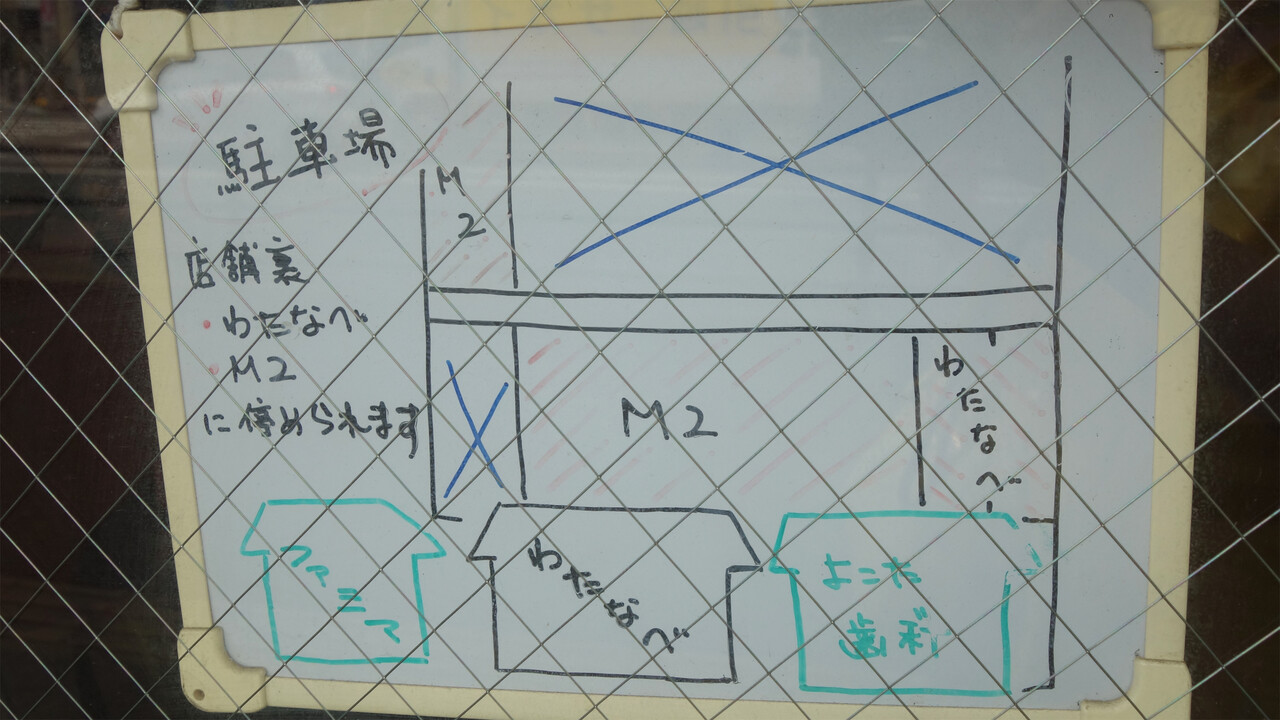 店舗の裏手に専用駐車スペースがあるようですが、今回は並びのコインパーキングに停めました(60分100円)。