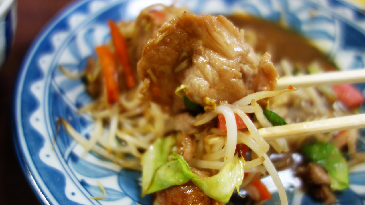 豚肉と野菜の炒めものですが、こちらにも細モヤシが一杯入っています。