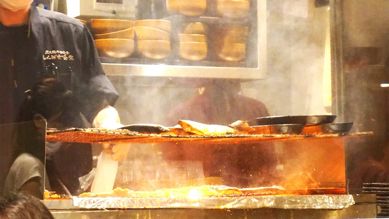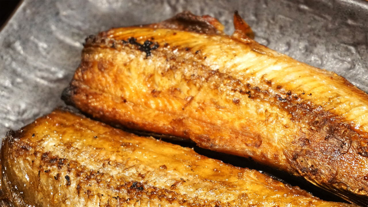 厨房の一角に焼き場が設けてあり、独自開発の炭火焼機でモクモクと干物が焼かれています。