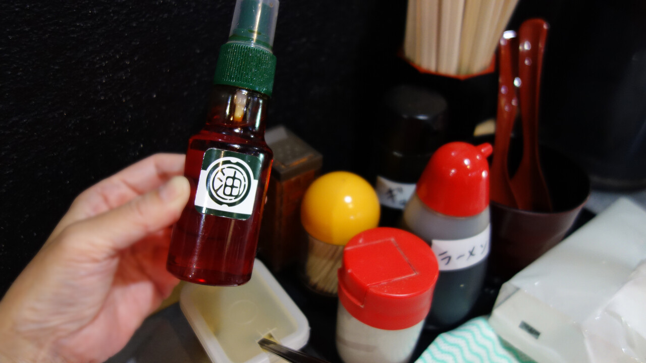 卓上には、ラーメンダレ・コショウ・一味・刻みニンニク・餃子用タレ・ラー油スプレーが置いてあります。