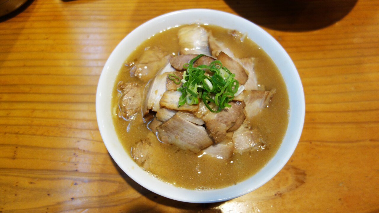 中央にドーム状に盛られたチャーシューと褐色のスープが印象的。