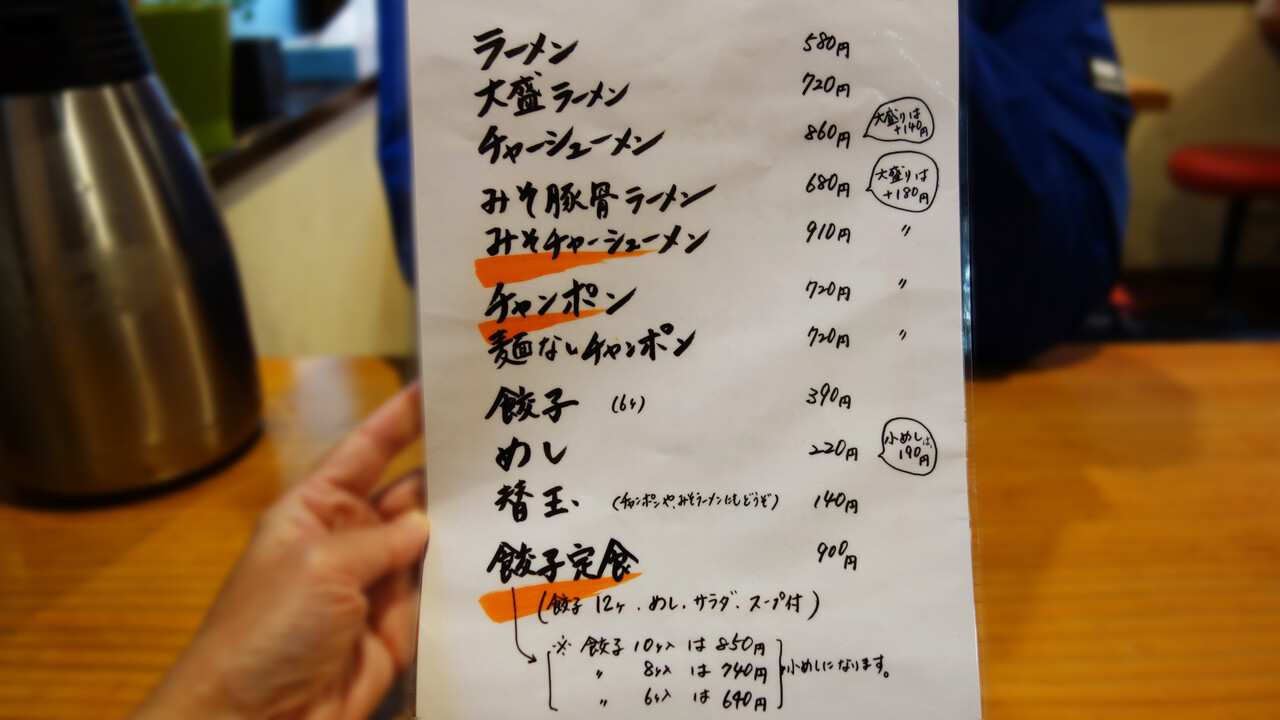 餃子屋さんですが、メニューの筆頭はラーメン580円。