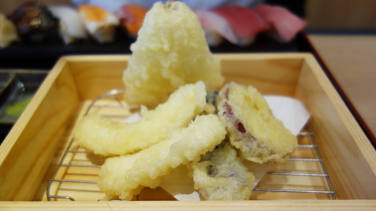 天ぷらには、キス・イカ2・ナス・カボチャが入ってました。
