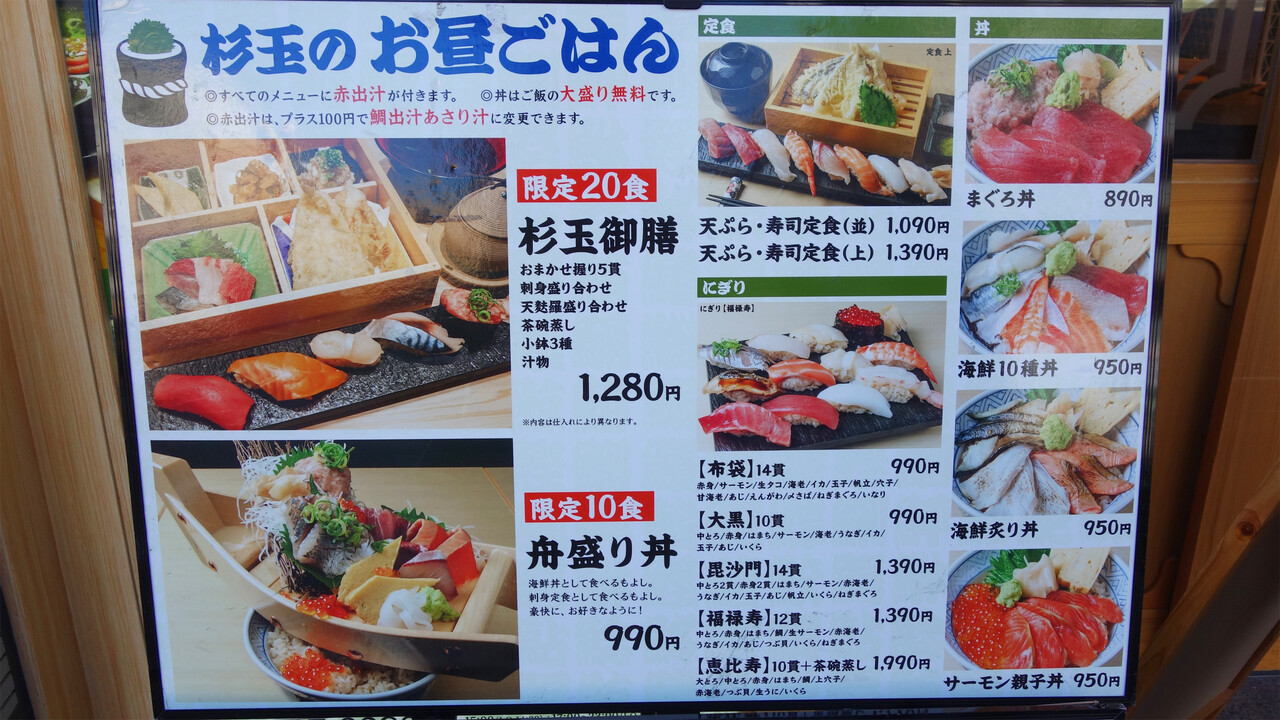 各種海鮮丼850円〜、各種にぎり寿司セット990円〜。