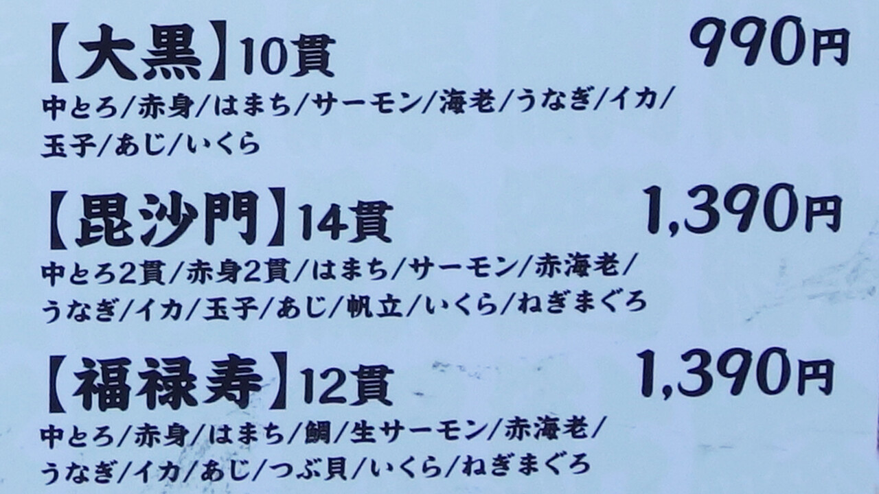 中トロ・赤身・ハマチ・タイ・生サーモン・赤海老・ウナギ・イカ・アジ・ツブ貝・イクラ・ネギマグロ。