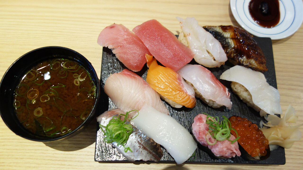 にぎり10貫・茶碗蒸し・赤だしの内容で、にぎりには大トロと上穴子が含まれます。