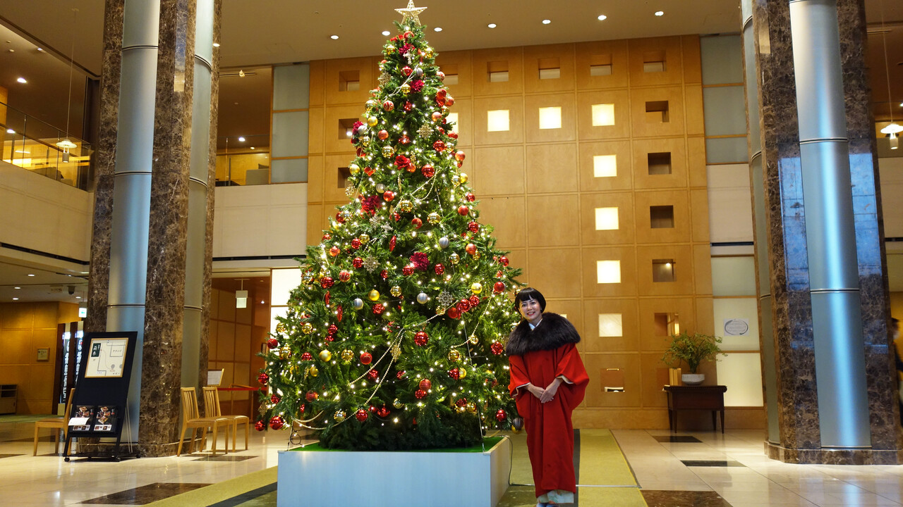 ホテルの1階ロビーにある大きなクリスマスツリーの前で記念撮影。