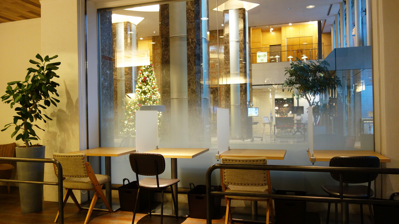 コロナ対策用の透明アクリル板が中央に設置してあるテーブル席をグループで利用しました。